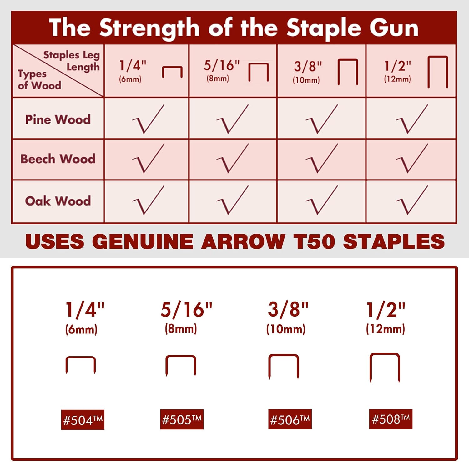 Extra 3750 Pieces Staples: Package come with 3750 Pieces 1/4″, 3/8″, 1/2″ Arrow T50 staples (Each 1250 Pieces), providing options for a variety of projects
