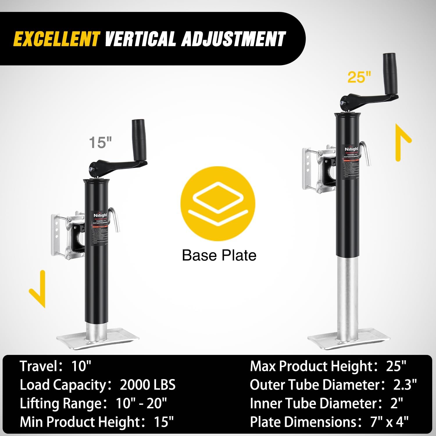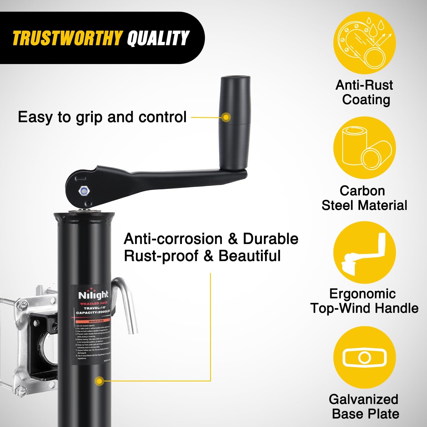 HEAVY-DUTY TRAILER JACK: Engineered for vehicles workloads, Nilight Bolt on trailer jack delivers a 2,000lbs lifting capacity, making it ideal for RV, boat, trailers, and heavy-duty equipment. Compatible with a variety of vehicles, meeting professional and home needs