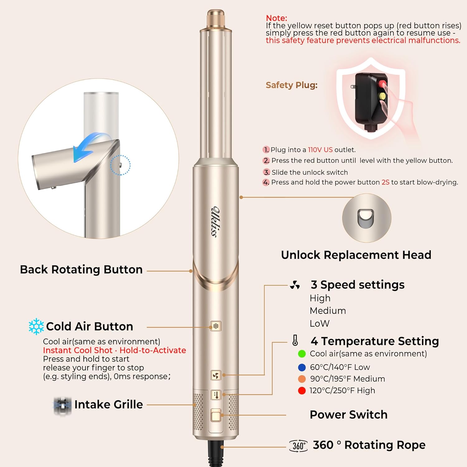 SAFETY FIRST: UKLISS hot air hair styler features an intelligent NTC temperature control system, a built-in bimetallic thermal switch, and a safety fuse, monitoring the temperature thousands of times per second to ensure optimal temperature control at all times. Simply press and hold the “Snowflake” button for rapid cooling. Multi styler hair tool models also feature an ALCI safety plug to prevent electric shock and come with heat-resistant gloves to protect your hands while styling.