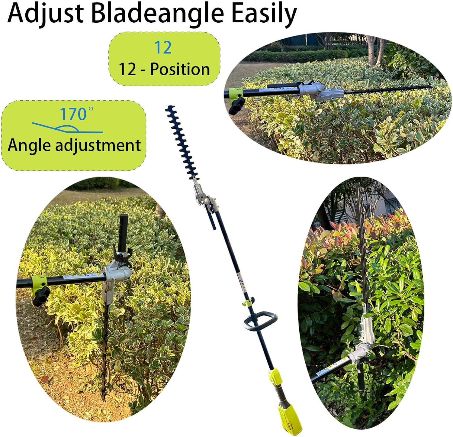 This articulated hedge trimmer accessory can be used with most brands of trimmers with accessories, and the 9-position hinge joint allows users to adjust the blade angle to adapt to various hedges. 16 inch dual action blades provide comfortable trimming and 3/4 inch cutting capability
