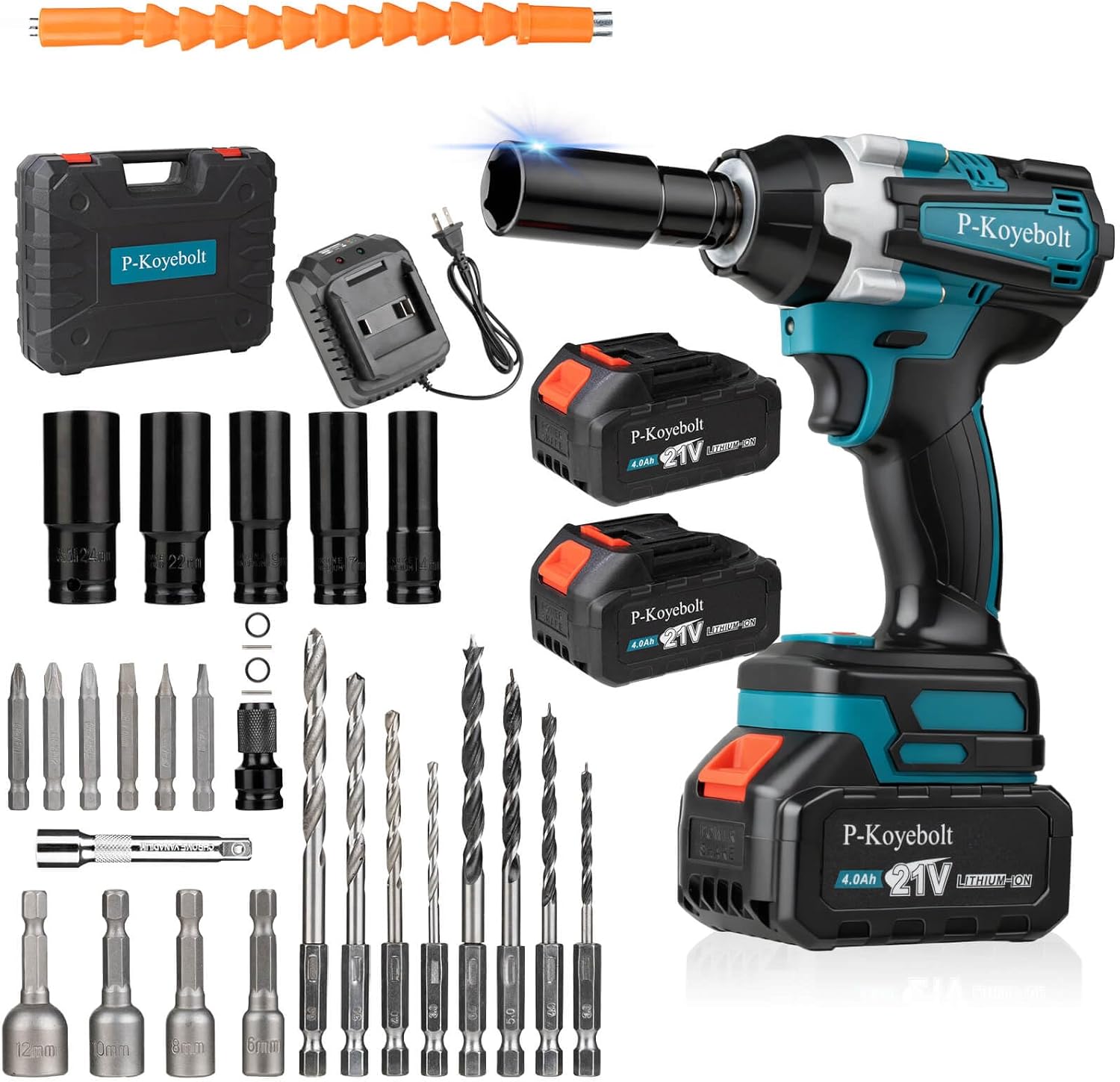 ć30+ Pieces All-Inclusive KitćP-koyebolt multifunctional cordless impact wrench comes with more than 30 pieces: a cordless impact wrench, 2 batteries, a rapid charger, 5 impact sockets (14mm/17mm/18mm/19mm/22mm), a socket adapter, an extension bar, 2 pins, 2 o-rings, a universal hose, 10 screwdriver bits, 8 drill bits, and a portable carrying case of equipment, which makes our multifunctional electric impact wrenches not only work as a cordless impact drill but also as a drive power electric impact gun. Users don’t need to buy additional accessories.