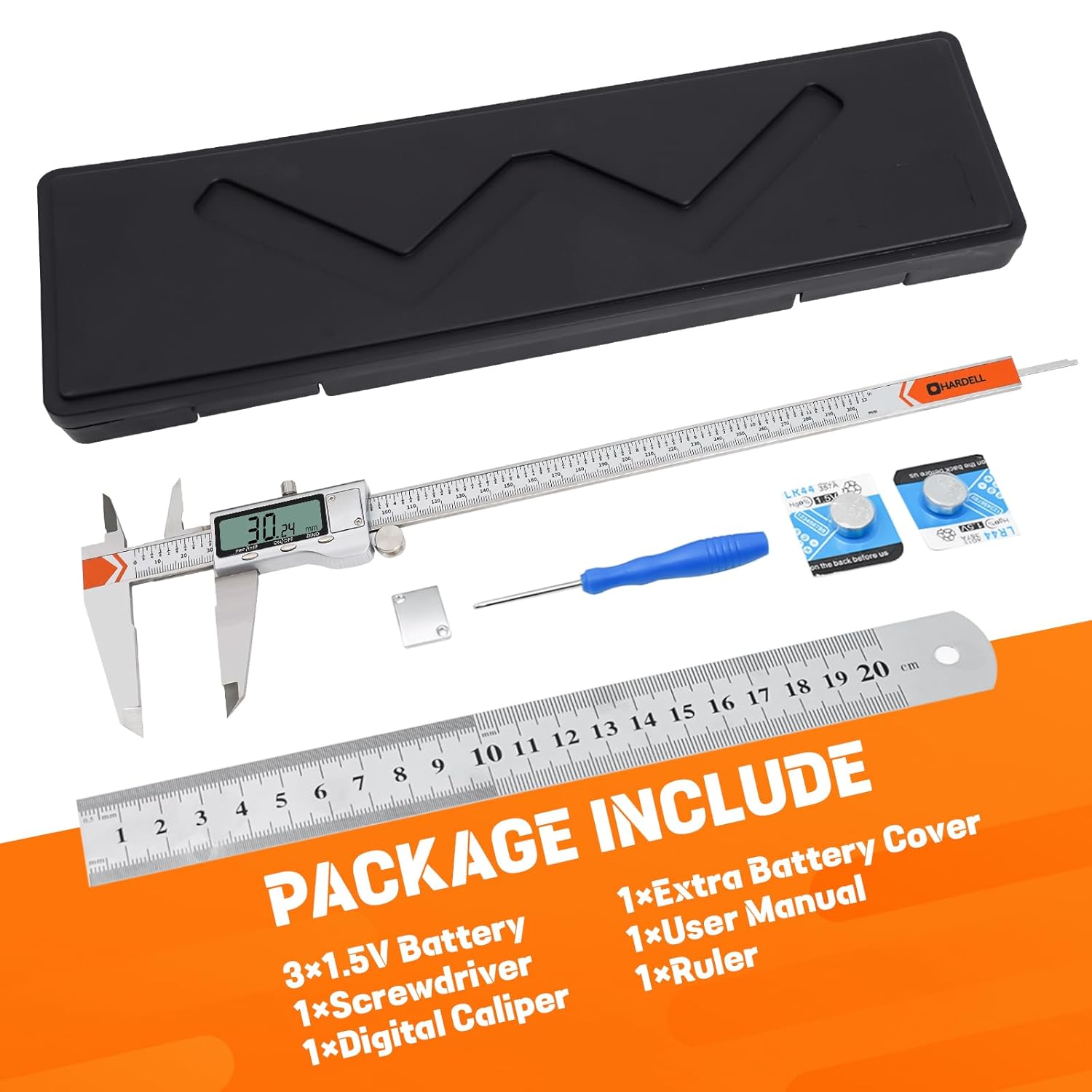 ćMore Critical Backup Includedć The 12 inch caliper is always ready: Includes 2 spare batteries, 1 dedicated spare battery cover with screws, steel ruler, and screwdriver. Never lose measurement time due to dead batteries or a missing coverāthese thoughtful extras of the high-precision calipers ensure uninterrupted precision for large-scale projects