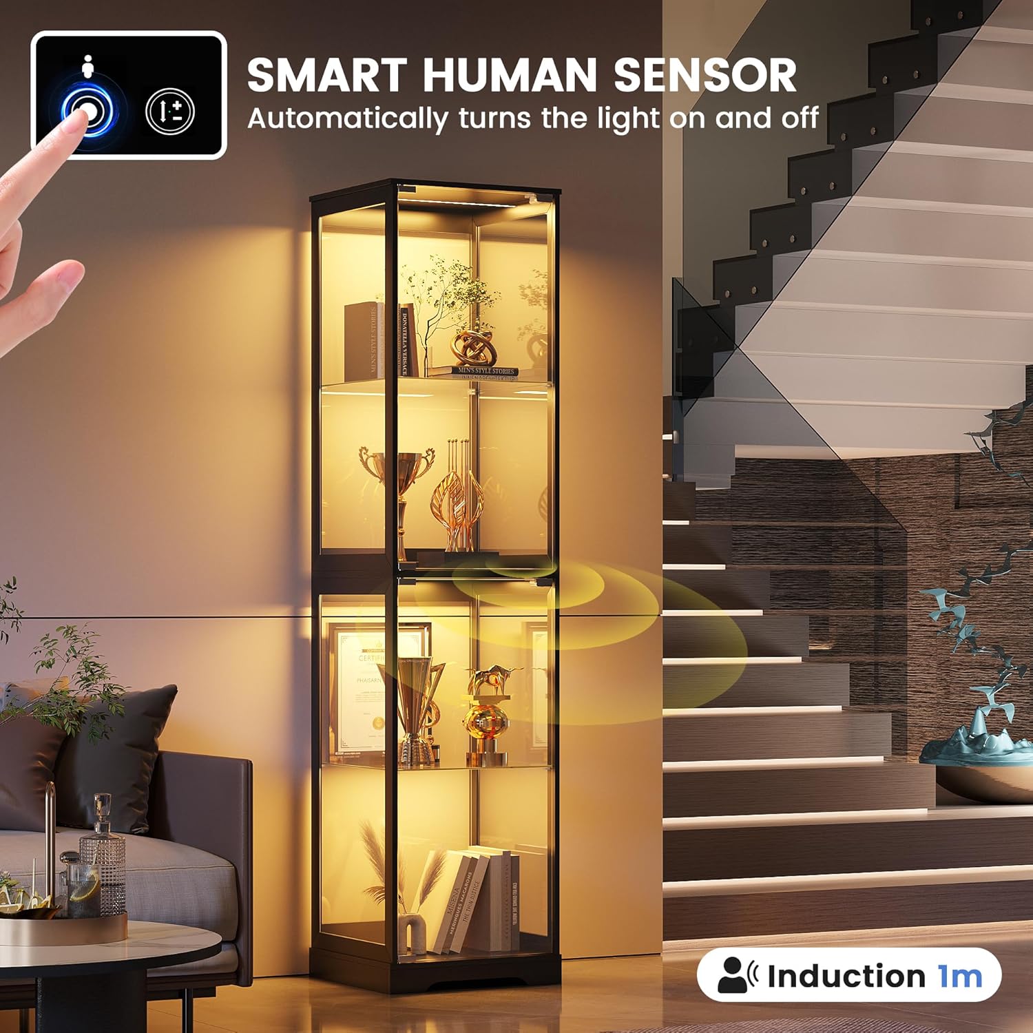 Glass Display Cabinet with Doors, 65″ Tall 4-Tier Curio Display Case with 3 Color Lights and Human Body Sensor, Bookcase for Collectibles, Black