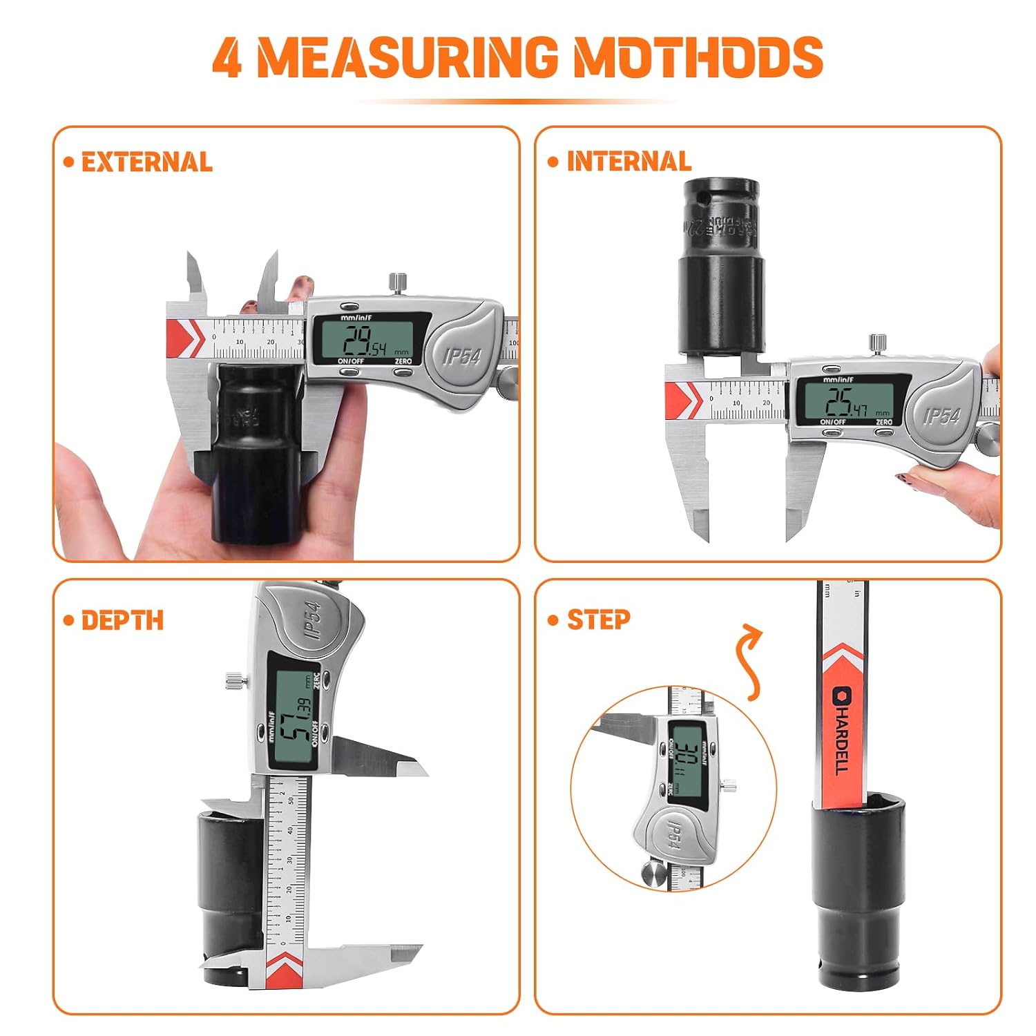 FOUR MEASUREMENT MODES: The digital caliper 6 inch offers four measurement modes for internal and external diameters, depth, and step measurements. This versatility makes it suitable for a wide range of applications, simplifying the measurement process