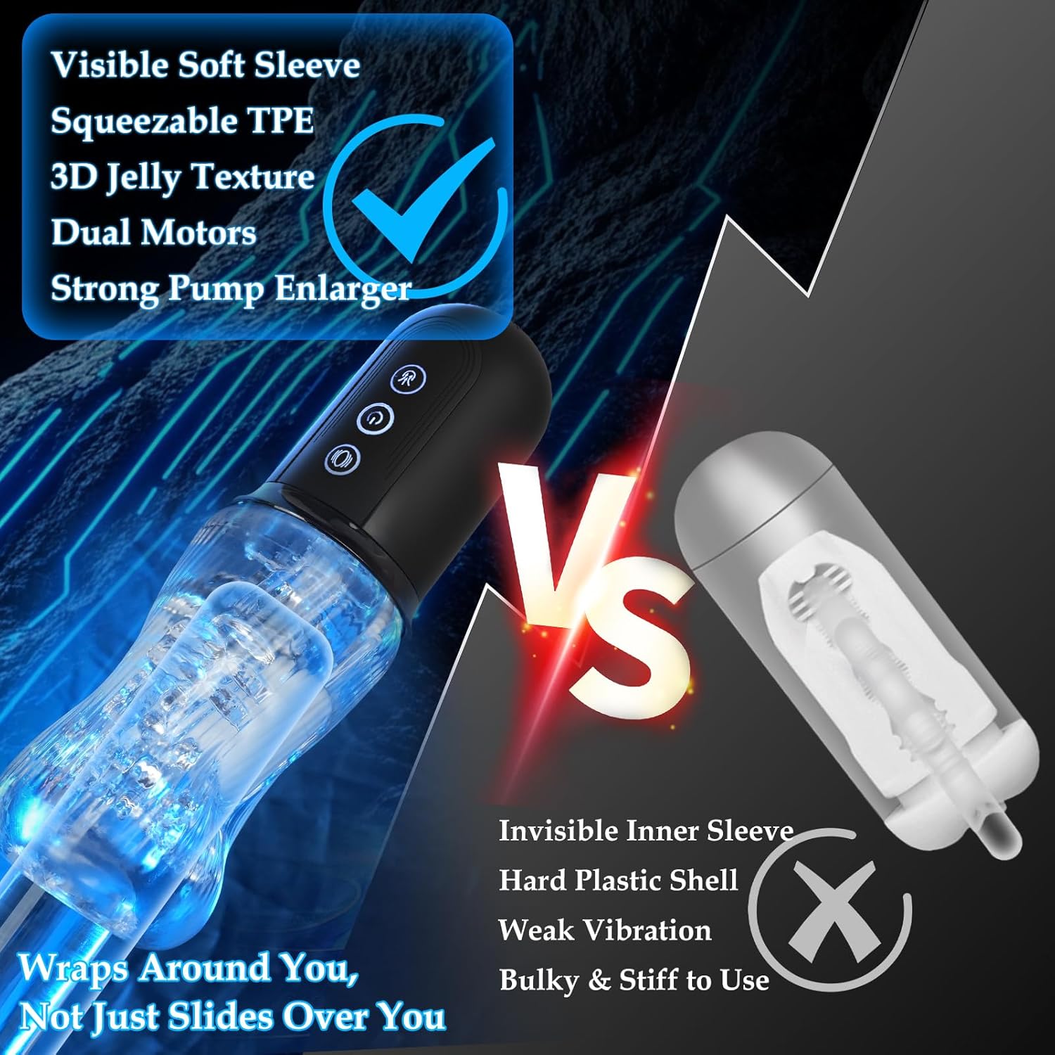 Dual Motors & 5 Suction Modes & 10 Vibration Patterns – Dual motors on both sides deliver full-wrap, surround stimulation. Choose from 5 suction and 10 vibration settings to match your rhythm