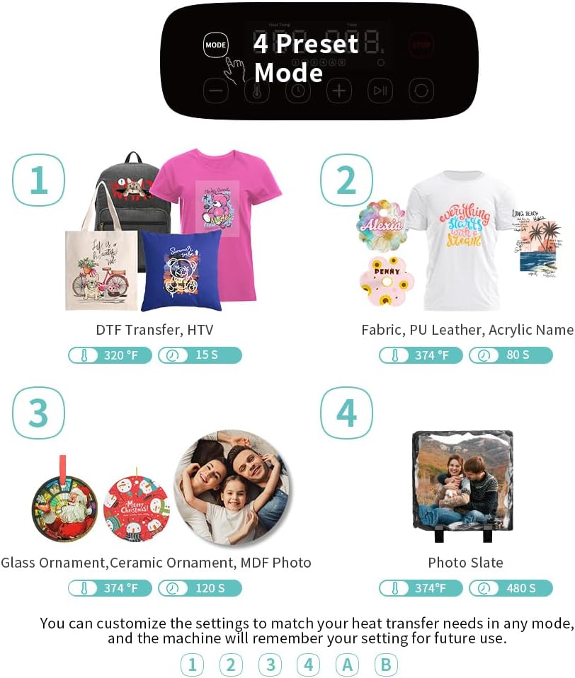 Pre-set and Customized Mode:The auto heat press machine with 4 pre-set mode,and 1-4,A,B mode,all of the 6 mode can be customized the time and temperature,the machine will remember your setting for future use.Will help save your setting time and make the bulk order easier.
