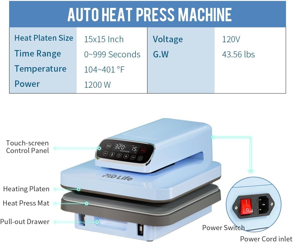PYD Life 120 V Auto Heat Press Machine for T Shirts 15″ x 15″ Touch Screen Light Blue Smart Heat Press for Sublimation Blanks Ornaments Frames Bags Sublimation DTF Vinyl Printing