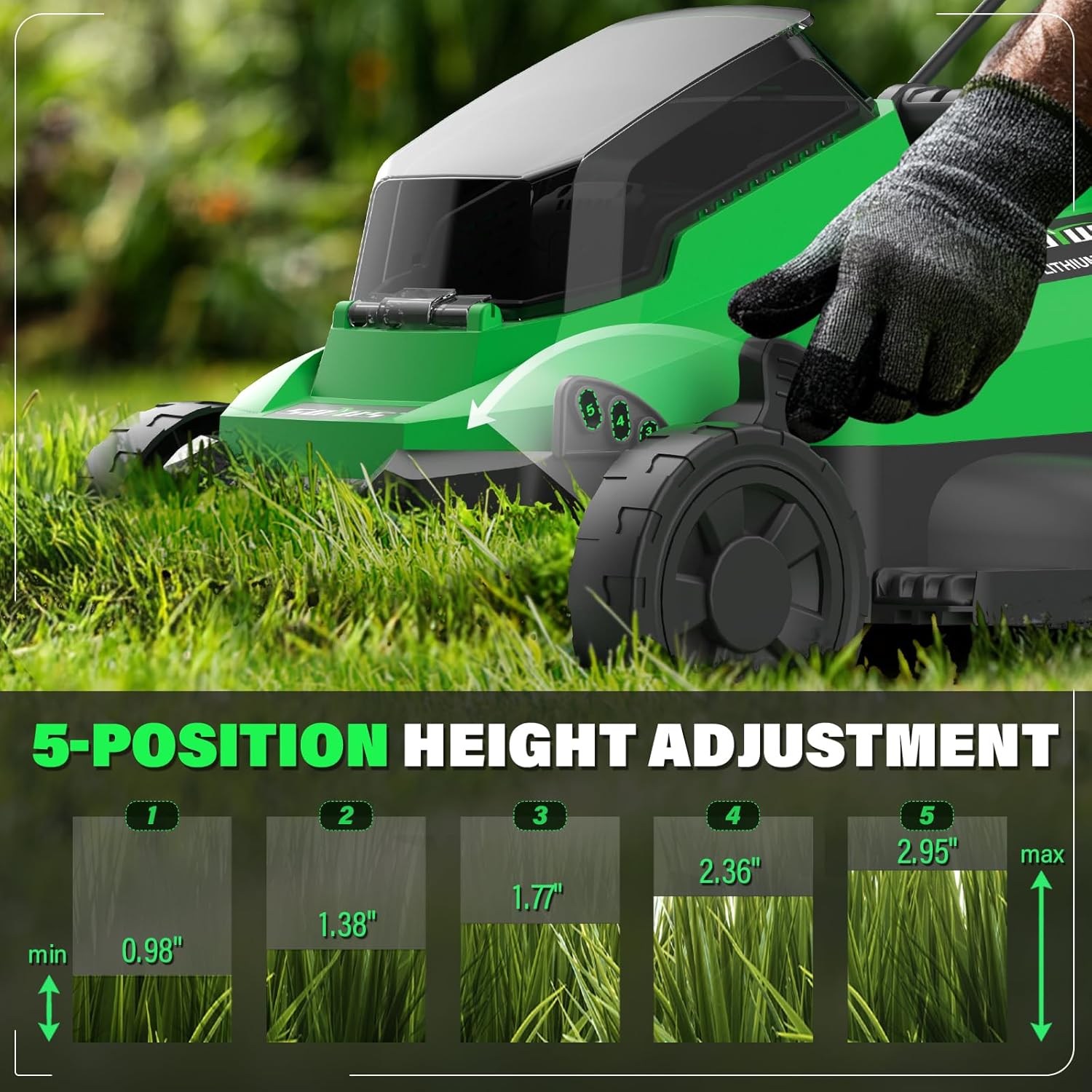 ć5-Position HeightćThe lawnmower has 5 cutting height adjustment, from 0.98″ to 2.95″,to satisfy the needs of different mowing heights.