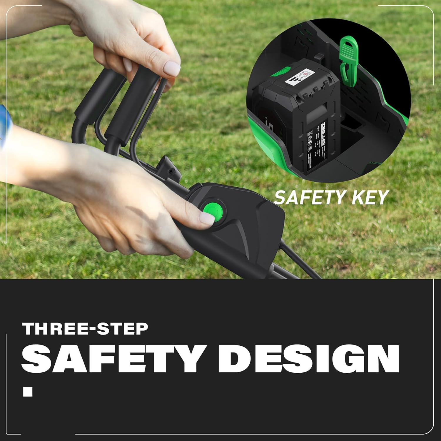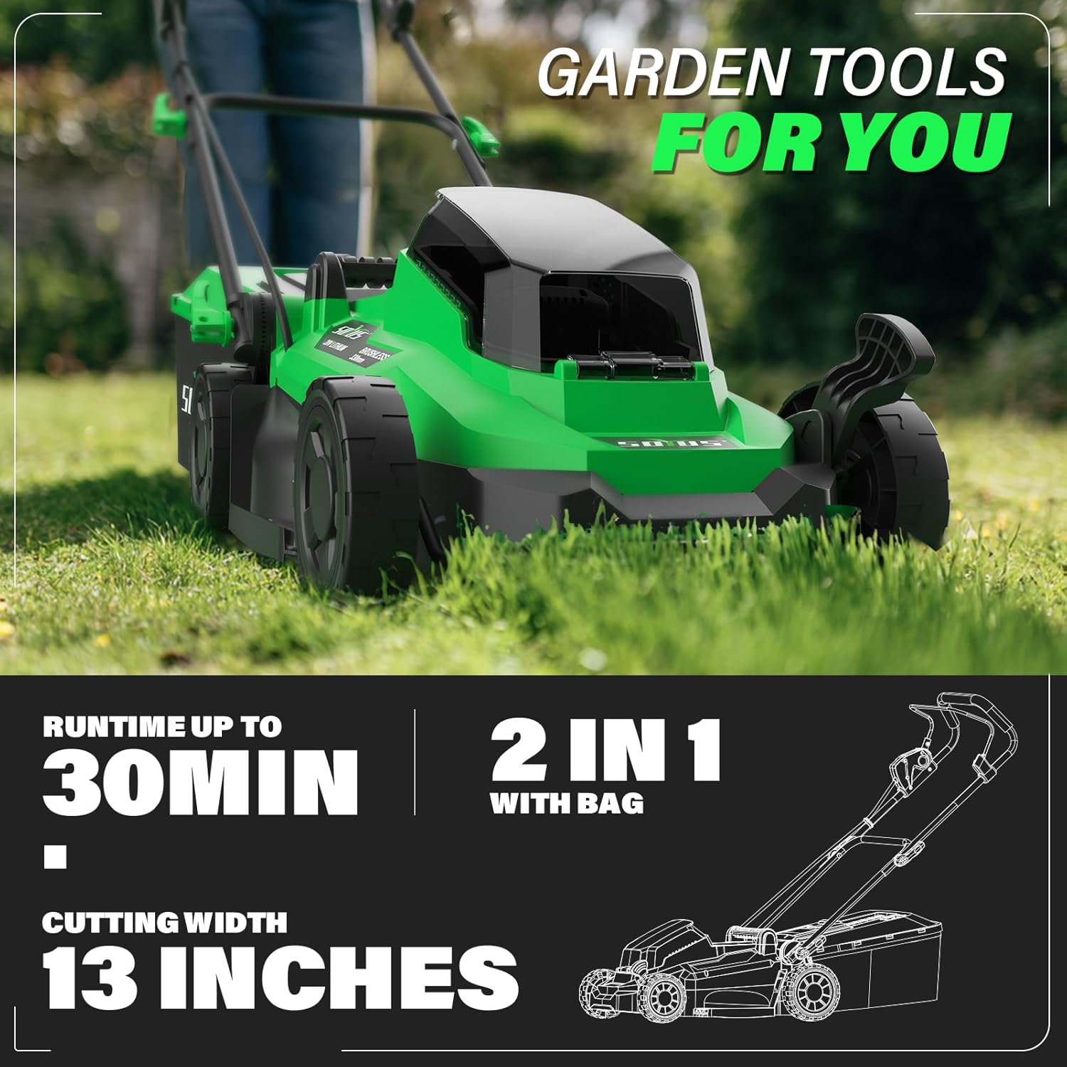 ćBrushless Motorć The electric lawn mower features brushless motors that are light in voice and low in vibration. Not only can it provide powerful power, but also without the trouble of noisy and dragging in gas lawn mower, corded lawn mower.