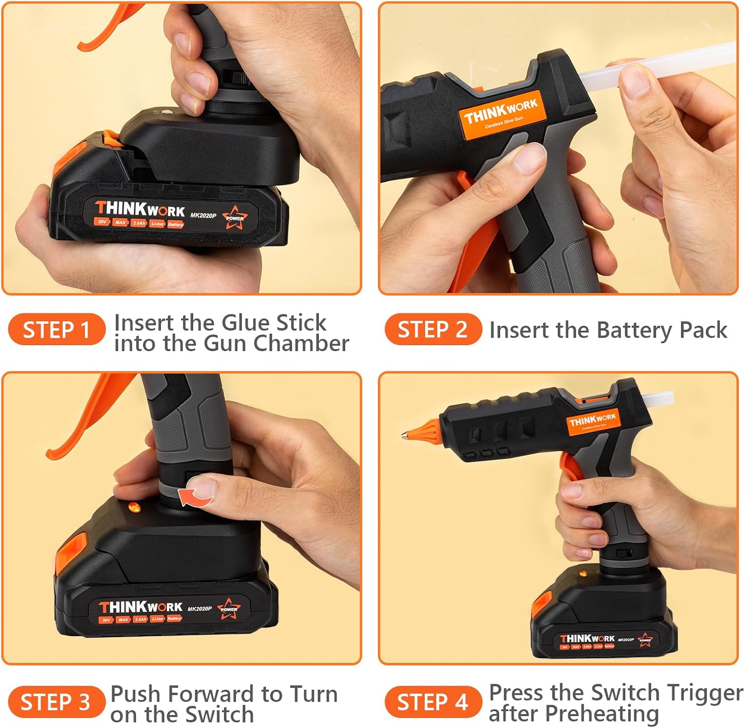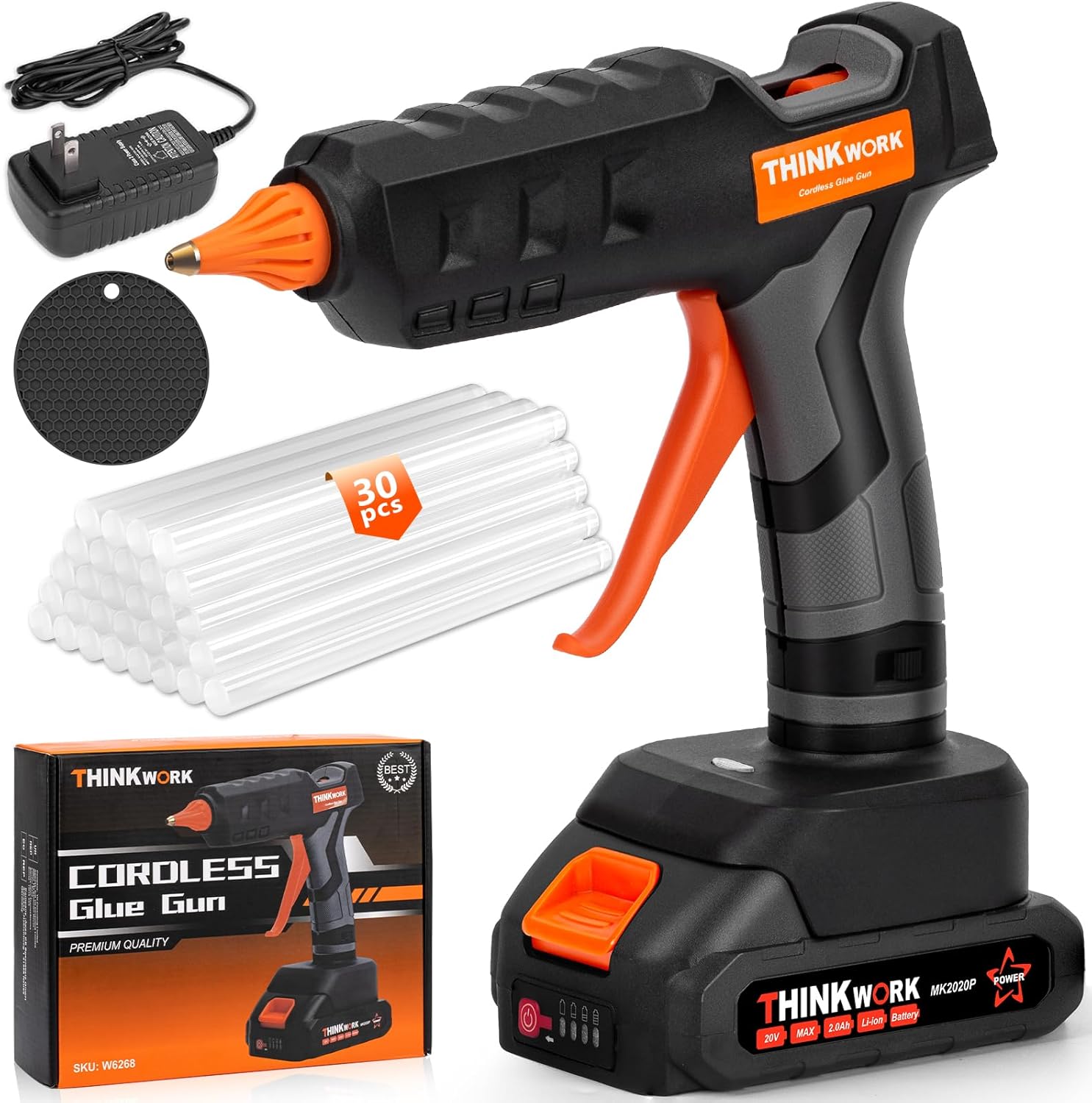 THINKWORK 20V Cordless Hot Glue Gun and Sticks Set, Rechargeable Glue Gun with 30 PCS Full Size Sticks and Battery, Fast Heating for Arts & Crafts, DIY Projects and Home Repairs