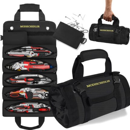 Tool Roll Bag, Expanded 5 Compartments and 2 Removable Tool Bags, Portable Tool Bag for Electricians and Mechanics, Compact Small Automotive Tool Bag, Black